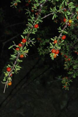 Description: The foliage of this plant is densely branched and spiny. Wolfberry is leafless during dry seasons, but refoliates quickly with rain. Axillary flowers are bell-shaped, appearing individually or clustered. The structure of the flowers suggests that bees are a favored pollinator, but they are also popular with butterflies and hummingbirds. Pea-sized berries resembling tiny tomatoes follow the flowers. Average life span of wolf berry is 90 years.