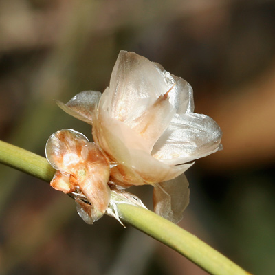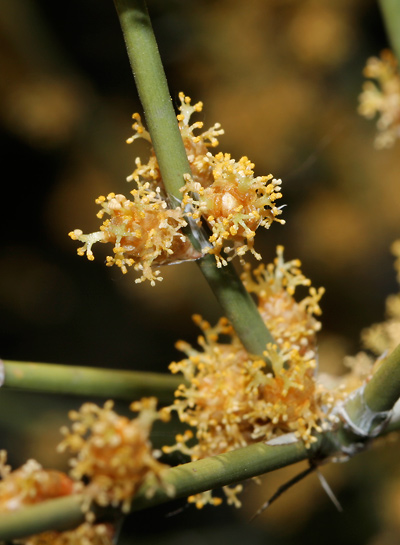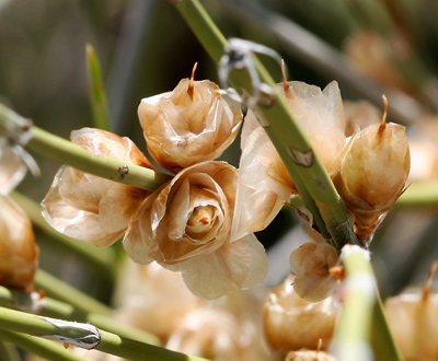 Description: The plants are dioecious. At the stem nodes, the male plants produce one or more reddish brown, egg-shaped pollen cones, while the female plants produce one or more reddish brown, flower-like seed cones with 6 to 9 whorls of circular, papery, translucent bracts in groups of three. The scale-like leaves grow in whorls of three at the stem nodes, will become dry, gray, and shredded with age, and can fall off. The stems are slender, rigid, jointed, initially glaucous yellow-green in color, and then aging to yellow and then gray. The base of the plant is woody.