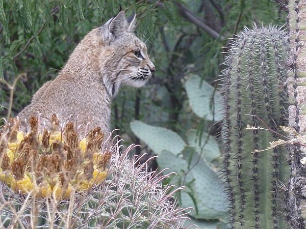 ![]() A bobcat (Lynx rufus) seems to stare in wonder and fascination at a middle-aged saguaro. |