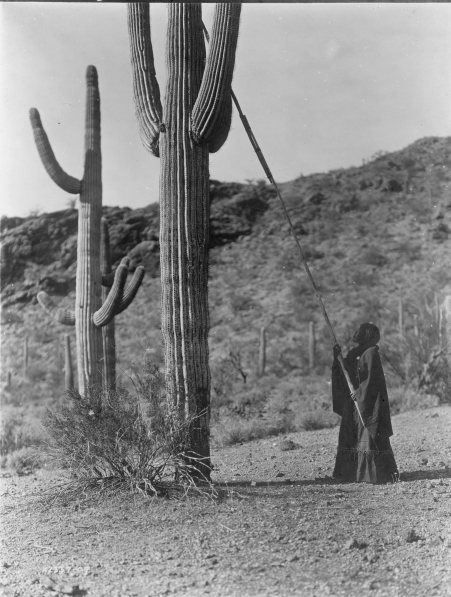 People are a minor but culturally significant source of seed mortality. We consume the fruit of saguaro because its pulp is sweet. The Tohono O'odham harvest the fruit (called bahidaj) and families process it into a syrupy food. Bahidaj matures (turns red) in the hot season just before the rains begin and must be harvested right away because rain spoils it. The families each give about a tithe to the community as whole. Those who receive it, ferment it for four or five days. Just before the monsoon begins, the result is used as a libation in communal prayers for rain (Thackery & Leding. 1929. The giant cactus of Arizona: The use of its fruits and other cactus fruits by the Indians. Journal of Heredity 20:400-414). |