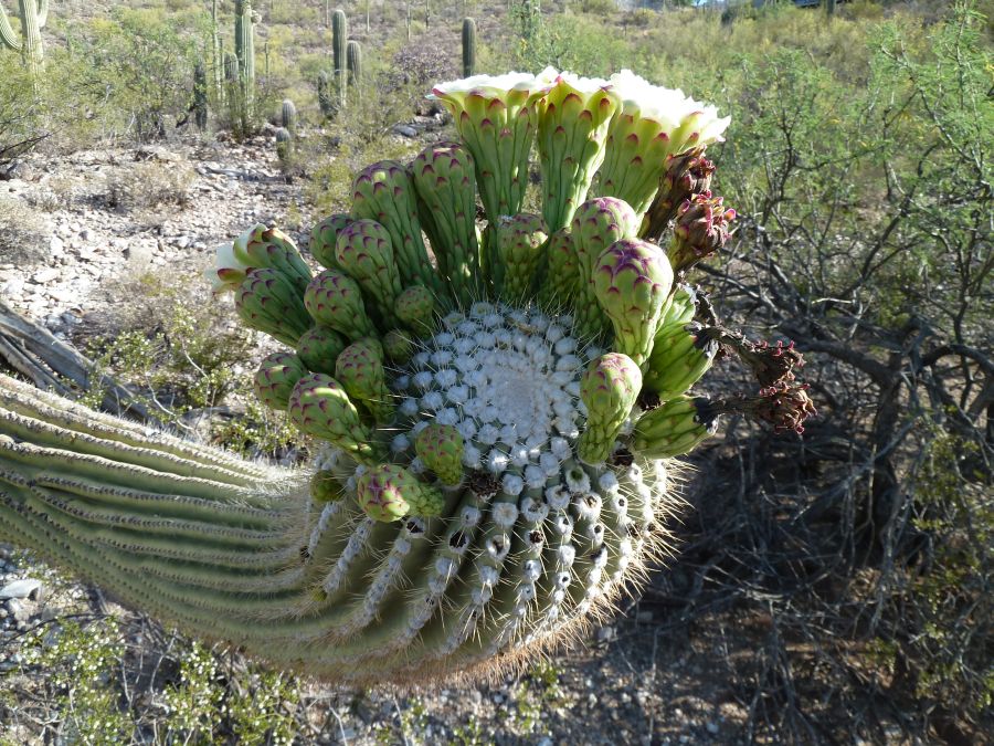 In the Tucson area, saguaros flower in May-June. Each flower lasts but a single day. It opens at night and remains open for part of the next day. It cannot pollinate itself, so it must get pollen from another individual. Pollen transfer is accomplished by long-nosed bats and white-winged doves and bees which visit the flowers to obtain nectar. In the Sonoran Desert, the two vertebrate pollinators migrate to our area in synchrony with the sagauro flowering season. Other species such as gilded flickers also help to pollinate the flowers.