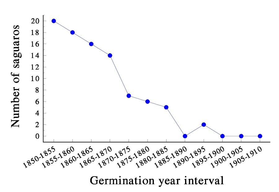Times of saguaro recruitment are clustered together in episodes. On the order of once or twice a century, a local population has a boom period. Their land overflows with young saguaros, all about the same age. This is called a cohort. But in between these episodes, saguaros experience extended periods of failure. |
