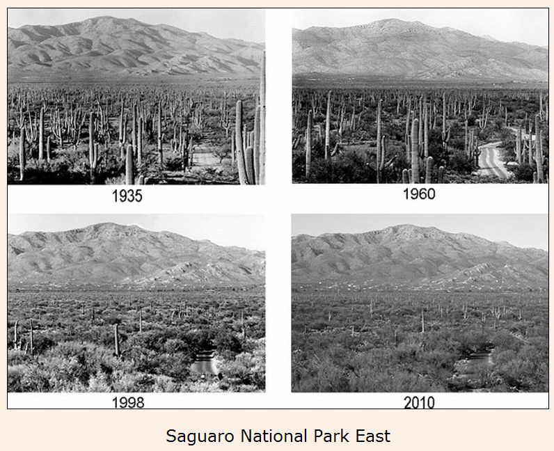 The same pattern shows up in the land set aside for Saguaro National Park, but the times are different. Look above at the repeat photographs taken in the eastern part of the park, the part that Homer Shantz selected in 1928 because of its abundant supply of vigorous saguaros. From 1935 to 2010, saguaros dwindled almost to the vanishing point. Meanwhile the Tumamoc population was burgeoning. It does seem fitting that such a majestic creature should be characterized by a stately rhythm of reproduction. |
