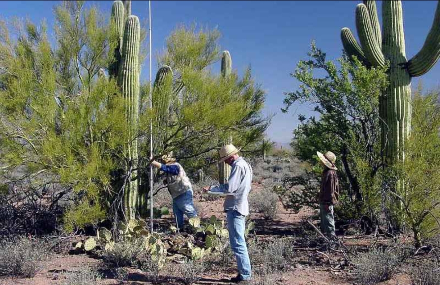 So Tumamoc keeps up its saguaro research. The plots that Hastings and Turner trimmed out of the old Spalding effort were very recently restudied by Ray Turner, Bob Webb and Susana Rodriguez. They used modern methods of global positioning and digitization, which improve our ability to analyze and compare individual plants and different years. |
