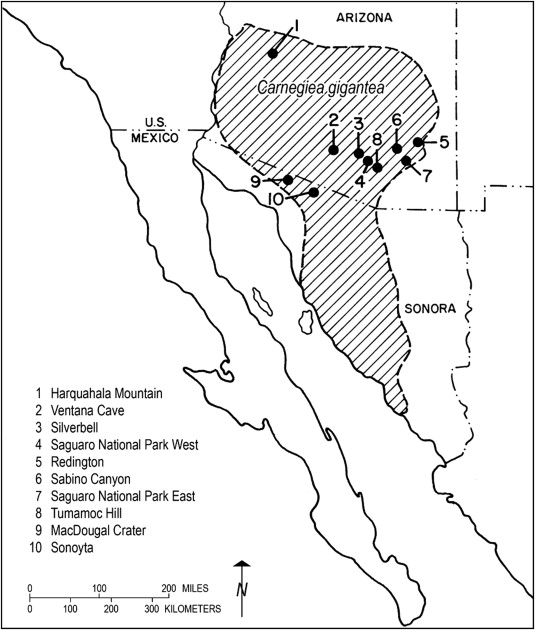 Map of the Southwest showing the extent of saguaro distribution (shaded area). |