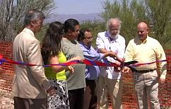 EPNG engineers and Tumamoc scientists devise a way to test the 1800-ft gas pipeline from 1933 while preserving the environment of the Hill and its research. Cutting the ribbon to open the project on a hot 22 August 2008 are (from the left) UA Pres. Robt. Shelton, Tucson Councillor Regina Romero, Pima County Supervisor Richard Elias, US Rep. Raúl Grijalva, Tumamoc Director Michael Rosenzweig and EPNG's Loren Locher.