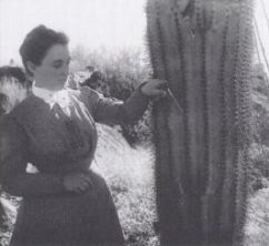 Effie Spalding measures the distance between the ribs of a saguaro.