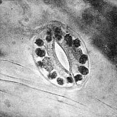 A microphotograph made by Francis Lloyd in 1906 of a stomate (Greek for mouth) in the surface of a plant leaf. The black bodies that surround the opening allow the plant to open and close the football-shaped hole in the middle. That, in turn, allows the plant to regulate its exchange of oxygen and carbon dioxide with the air outside.