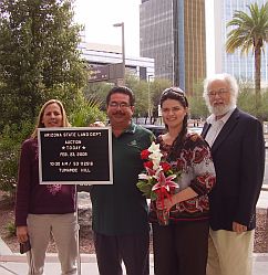 Pima County buys the southwestern 320 acres of the Tumamoc reservation at public auction, 23 February 2009. Four very interested, very happy parties pose afterwards, relishing the victory. From the left: Christina McVie (Board chair of the Coalition for Sonoran Desert Protection); Pima County Supervisor Richard Elias; Tucson Councillor Regina Romero; Tumamoc Director Michael Rosenzweig