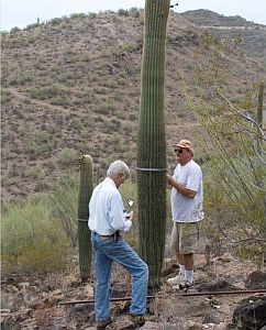 In 2011, Ray Turner and Bob Webb install a spring-loaded brass band to measure changes in saguaro diameter after each rain event.